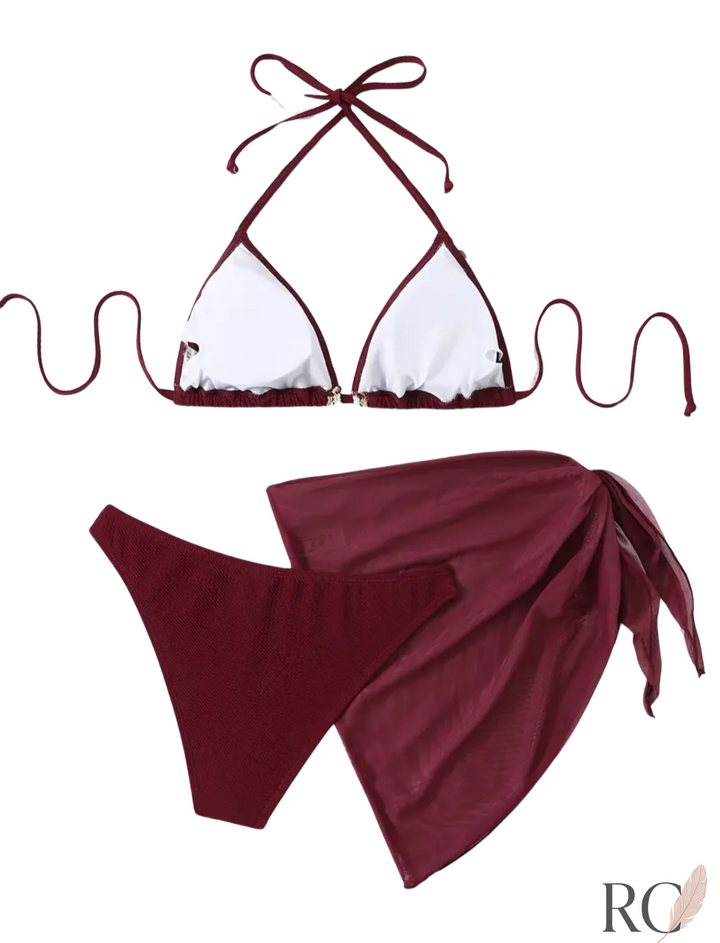 Embrace soft glam with this beige shell-embellished triangle bikini set. Paired with a dreamy sheer sarong, this look is all about laid-back beach luxury with high-stretch ease.
