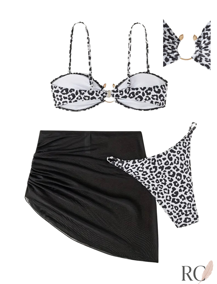 Fierce, flirty, and fabulous with this sheer leopard print bikini set includes a V-neck top, matching bottoms, and a light skirt cover-up. Made for bold women who love to turn heads at the beach or pool.