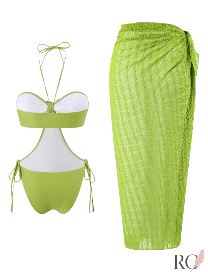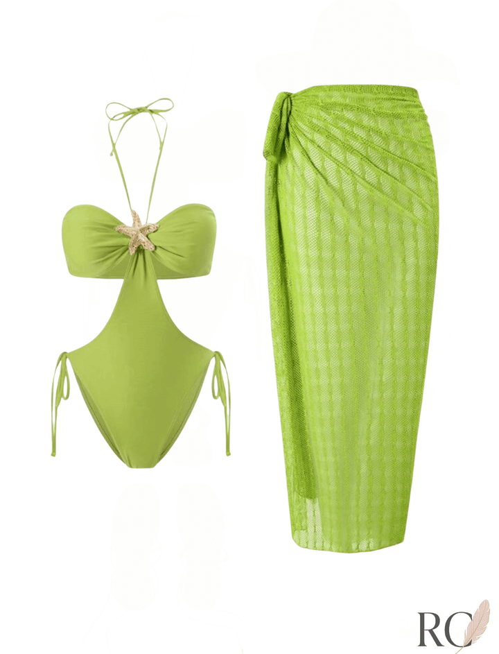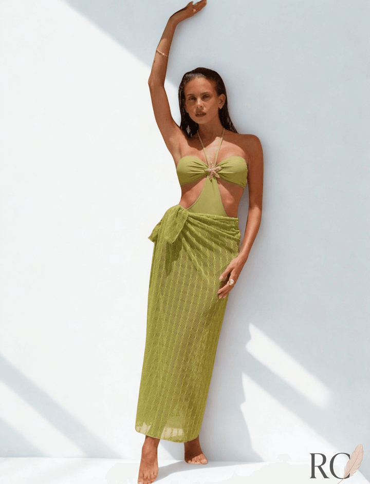 Channel ocean goddess energy with the Mermaid Mirage. This halter neck one-piece swimsuit features side hollow-out detailing and comes with a starfish mesh overlay skirt for a magical, mermaid-inspired beach look. Perfect for tropical vacations or summer events.