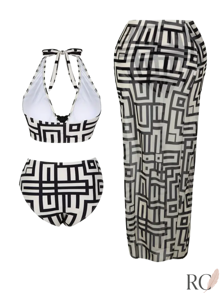 A 3-piece bikini set for women who crave graphic style with soft accents. Featuring a black & white geometric top, lace‑up detail, and floral-accent maxi skirt ideal for modern beach chic.