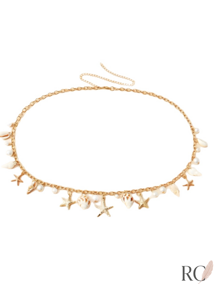 Add dreamy coastal elegance to your ensemble with the Pearl Dunes Shell Waist Chain. Designed with synthetic pearls and a starfish pendant, this adjustable black waist chain is perfect for beach days, pool parties, and vacation shoots. Elevate even the simplest bikini with this stunning detail.
