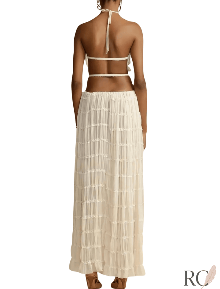The Ruffle Skirt Set brings an elegant twist to beach and resort wear. Featuring an off-shoulder ruffle top and matching skirt in a soft beige tone, this backless polyester set flows beautifully for a flattering silhouette. Ideal for beach holidays and summer evenings.