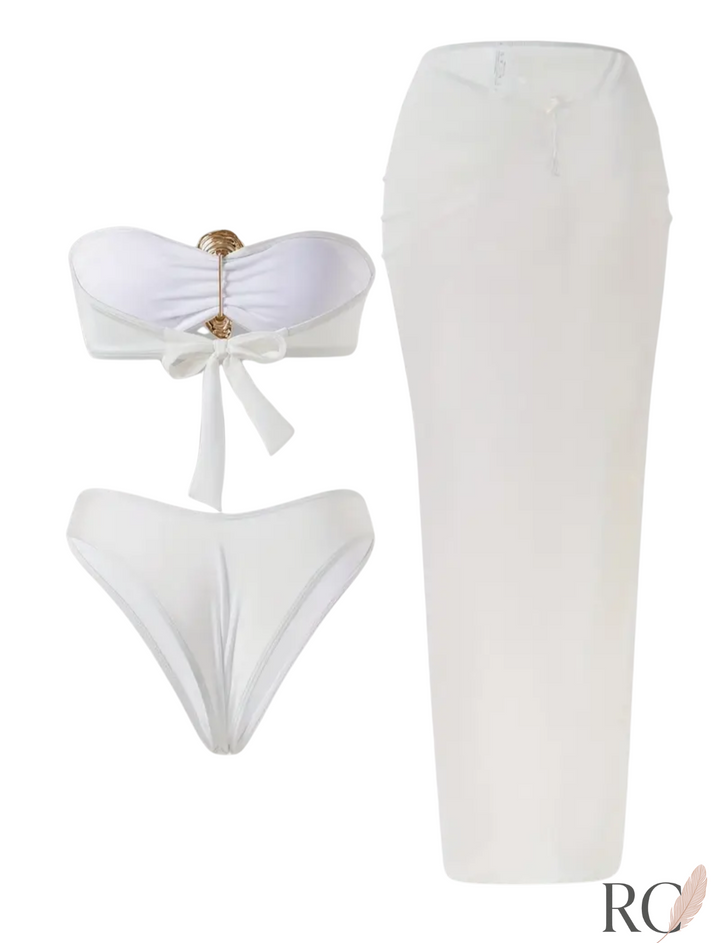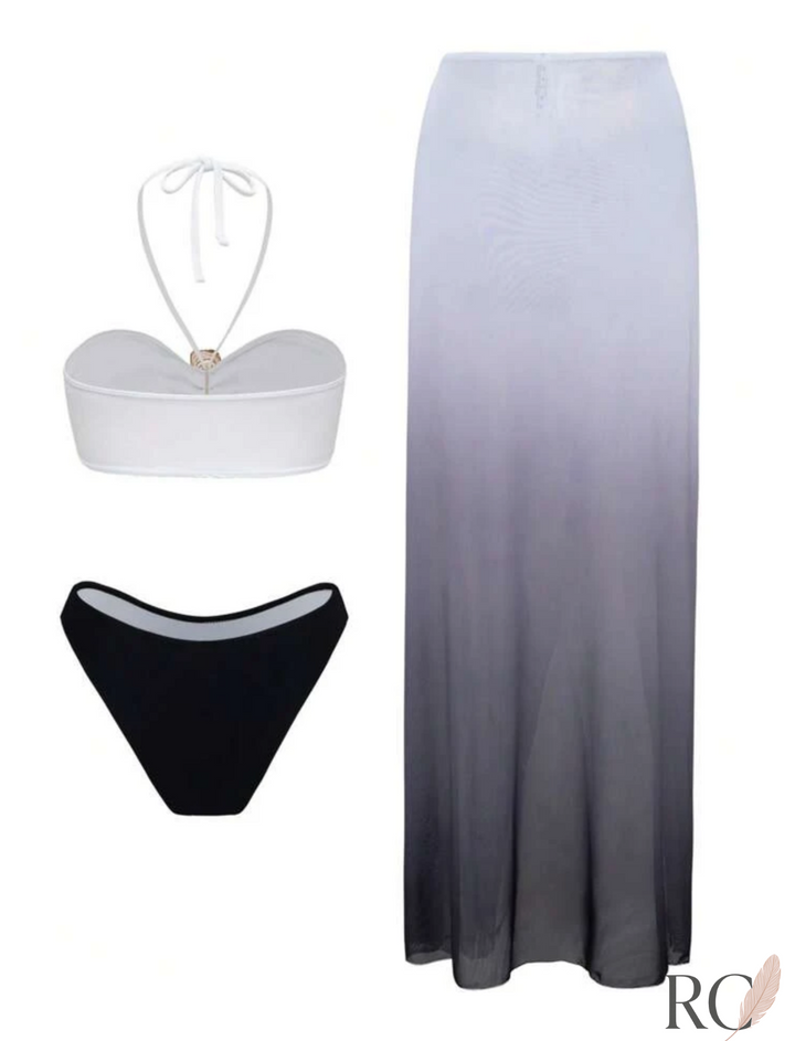 An ombre halter crop top with metallic accents, paired with sleek bikini bottoms and a matching flowy beach shirt. A sun-to-soirée showstopper.