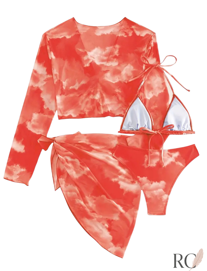 This sexy 4-piece printed beachwear set features a neck bikini, mesh cover-up, wrap skirt, and beach layer, a complete vacation-ready ensemble that flows like the sunset skies.