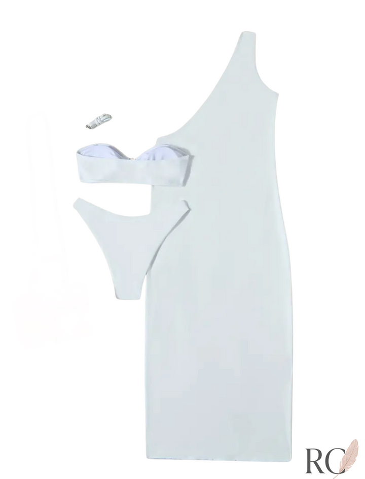 This ethereal 3-piece white bikini set features a halter neck tie-back bikini, matching bottoms, and a breezy mesh cover-up adorned with starfish metal details. A sun-kissed statement in crisp, clean white.